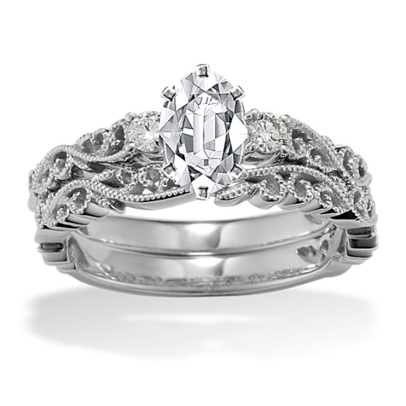 Both the engagement ring and wedding band in this 14-karat white gold set feature vines of milgrain detailing for a matching vintage-inspired look. The engagement ring has a three-stone design with a pair of natural diamond side stones that will sparkle alongside the center stone of your dreams. For more information on selecting your center stone, live chat online, call a customer service representative at 1-866-467-4263, or visit one of our store locations.