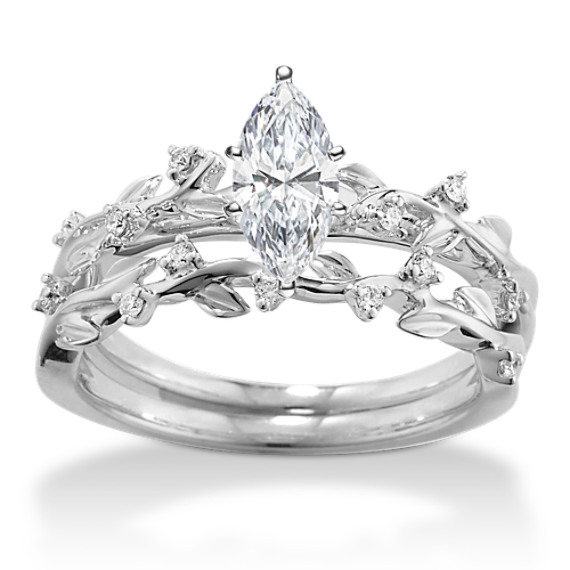 Bright 14-karat white gold leaves are dotted with natural diamond accents giving a dreamy, botanical feel to this wedding set. The cathedral setting of the engagement ring awaits your choice of center stone to make this set complete. For more information on selecting your center stone, live chat online, call a customer service representative at 1-866-467-4263, or visit one of our store locations.