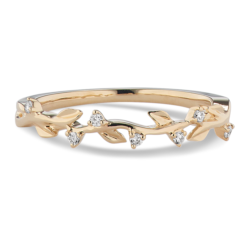 Warm 14-karat yellow gold leaves are dotted with natural diamond accents giving a dreamy, botanical feel to this wedding set. The cathedral setting of the engagement ring awaits your choice of center stone to make this set complete. For more information on selecting your center stone, live chat online, call a customer service representative at 1-866-467-4263, or visit one of our store locations.
