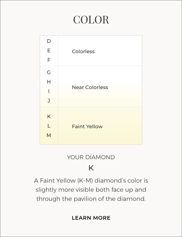 This natural Round diamond contains very slight inclusions which are occasionally visible under 10x magnification. The warmth and tone in this diamond displays a faint yellow hue. An "Excellent" cut diamond reflects most of the light that enters it, displaying stunning proportions of fire and sparkle.