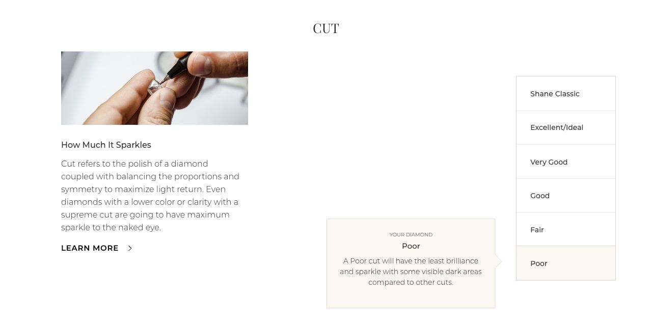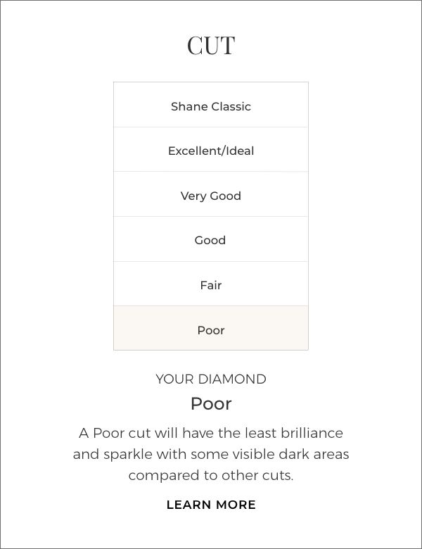 This natural Round diamond has inclusions that are obvious under 10x magnification and are visible to the naked eye. The very light hue in this "near-colorless" diamond may be slightly visible when compared side by side with a diamond of a higher grade. A "Poor" cut diamond tends to appear dull and has the least amount of fire and sparkle.