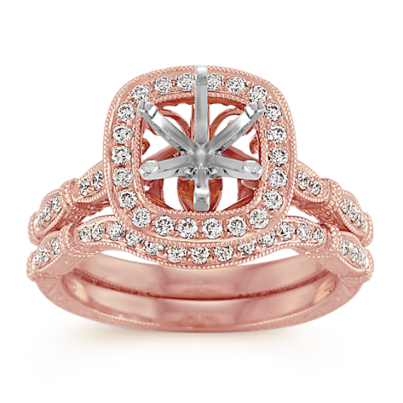 Freesia Halo Vintage Rose Gold Diamond Wedding Set with Pave Setting