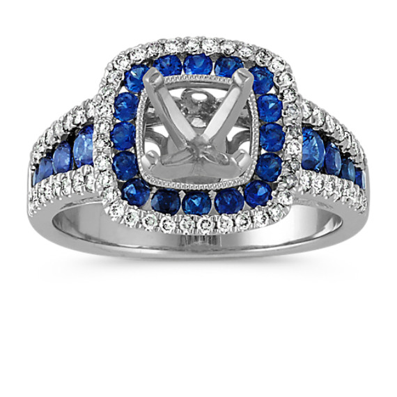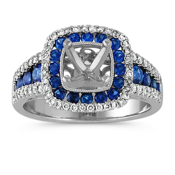 Cushion Halo Engagement Ring with Traditional Sapphires and Round Diamonds