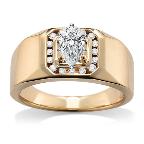 A halo of channel-set natural diamond accents is waiting to surround the round center stone of your choice with superior sparkle and fire. Crafted in warm 14-karat yellow gold with a brushed finish, this bold ring can accommodate an engraving for further personalization. For more information on selecting your center stone, Live Chat or call an online customer service representative at 1-866-467-4263, or visit one of our store locations.