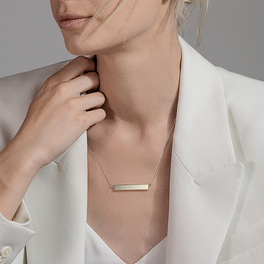 This 14-karat white gold bar necklace is the perfect canvas for a custom engraving on the front, back, or both. It comes complete on a matching cable chain, making a beautiful gift or daily accessory. For more information about custom engraving, live chat online, call a customer service representative at 1-866-467-4263, or visit one of our store locations.