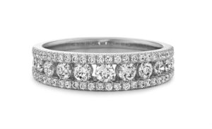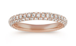 Pavé rings are classic and timeless. But what does it mean, exactly? Pavé is a setting for mounting small diamonds and gemstones. The word “pavé” is derived from the French word meaning “pavement.” Just as stones are paved on the street, the diamonds are “paved” on the surface of the jewelry. This is done as a tight grouping of same-size stones. It creates ultimate sparkle due to the small amount of space between the stones.
