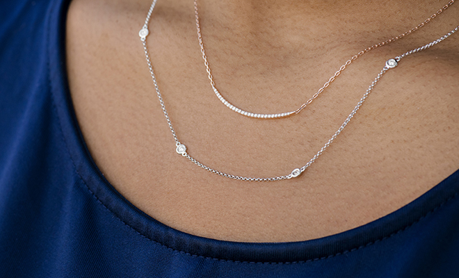 Mix up the lengths of each necklace. To layer properly, it essentially comes down to equal spacing and varied chain length. Each necklace is its own piece and its sparkle can’t be covered up by another chain. Make sure there is space between each necklace so that each one can shine alone, but stun together. We love how this fashionable and on-trend 14 karat yellow gold curved diamond necklace with 27 brilliant round diamonds fits perfectly with this shining 14k white gold cable chain with four bezel-set round diamond stations.