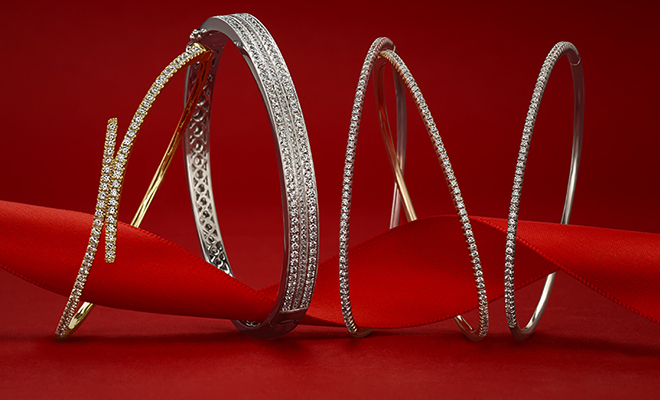These tips and tricks can be applied directly to stacking bracelets as well. Bangles can be some of the easiest bracelets to mix and match and can make the art of stacking simple. These 14k rose gold, white gold and yellow gold bangles with 59 brilliant round diamonds pair perfectly with a 14k yellow gold overlapping diamond bangle with 64 pavé-set round diamonds. Your wrist won’t have seen so much sparkle once you throw on a 14 karat white gold diamond bangle bracelet with 186 brilliant round pavé-set diamonds. While the overall feel of this stacked look is cohesive, it’s the styles and mix of metals that really add the necessary drama.