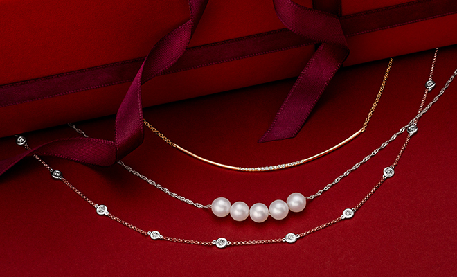 Mix or unify metals. Many people will say to keep the metals unified and only pair yellow gold necklaces with more yellow gold, but we think that a little of our signature rose gold paired with white gold isn’t a deal-breaker. Mix those strands and have fun with layering. This alluring curved bar necklace is sure to add sparkle with its 17 round diamonds that have been hand-selected for exceptional brilliance. Add that to a white cultured freshwater pearl necklace crafted from quality sterling silver and an elegant two-tone 14k rose and white gold necklace with 16 brilliant round diamonds and you have a look that will turn heads at every holiday party.