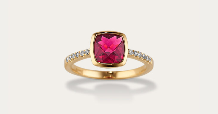This gorgeous ring is going to stun in 2023 and beyond with its impressive magenta color. Available in white gold or yellow gold, the center stone is surrounded by dazzling accent diamonds. Shop this ring for a bold new look!