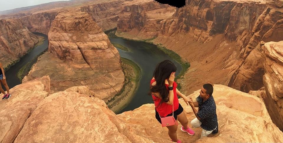 “My boyfriend and all of his friends planned a trip to Las Vegas. So we flew down to Vegas but then they decided to drive down to Arizona. We went somewhere I have always wanted to go: Antelope Canyon and the Horseshoe Bend. He said let’s take a picture, so I walked over to a spot and when I turned around everyone was out of the way and he was on his knee.” — Eva H.
