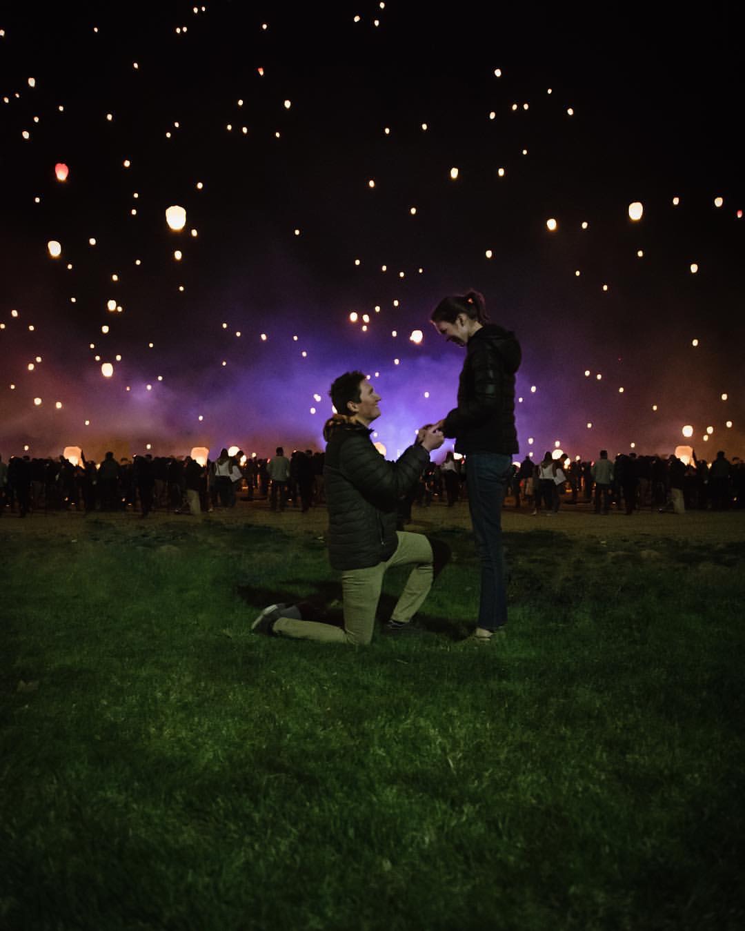 “I had planned a date to the lantern festival and was extremely excited! We got all our supplies and picked a spot to sit down. They gave us a lantern, s’mores stuff, a marker and a lighter. Gavin had the fun idea to sit back to back to draw on our lanterns. I got done way quicker than he did and had to wait and wait. It was finally time for everyone to light their lanterns and he was still doodling, telling me not to look. I was getting anxious because I wanted to light my lantern with the other thousands of people there! Gavin helped me light mine and we sent it up into the air. Then it was time to light his and as it was filling up with hot air, getting ready to lift into the sky, I saw my name written on it with ‘Will you marry me?’ I was so happy as we sent it up into the air and a super nice lady that happened to have her nice camera took some pictures of us. They’re the best I could have ever asked for, which is crazy since it wasn’t even really planned for her to take our pictures! Everything turned out magical.” — Hanna N.