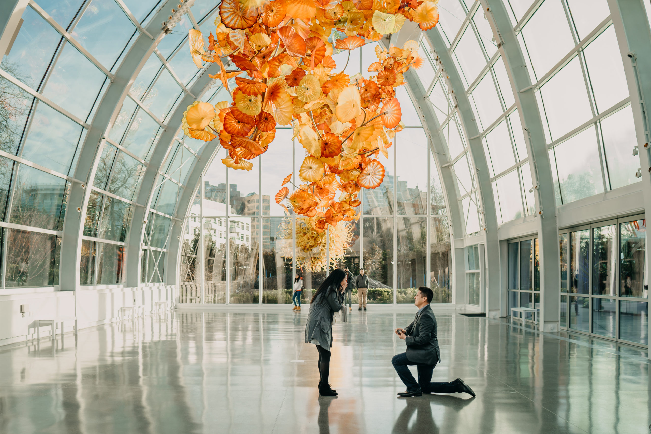 “Aaron proposed to me on December 12, 2017, at the Dale Chihuly art museum. We dated long-distance for two years before making Seattle our home. I had been wanting to visit Chihuly’s exhibit for a while because of his extravagant artwork. A few weeks before the proposal, Aaron forwarded me an email from his company stating that they had extra tickets for the exhibit and I was thrilled. Little did I know that the email was fake and he had purchased the tickets himself and had his coworker write an official email to offer him the tickets. He had gone through the exhibit to find the perfect spot, had his cousin take me to get our nails done, hired an amazing professional photographer, Sasha Reiko Photography, and surprised me with the most beautiful proposal and the most gorgeous emerald cut engagement ring. Thank you, Shane Co., for making this day so special!” — Melissa M.