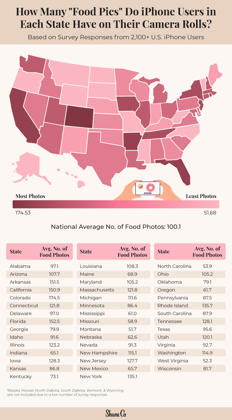 In order to determine where the most foodies are located, Shane Co. asked 2,153 iPhone users across all 50 states and several demographics to record the number of food pictures they currently have in their camera rolls. From there, we were able to calculate the average number of iPhone food photos in each state. Our goal was to cook up some foodie insights to find the states that are the most and least obsessed with their food and food photography. The survey ran from November 24 to December 6, 2021.