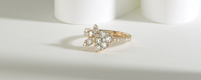 For more rose gold sparkle, this Diamond Floral Ring in 14k Rose Gold has vintage-inspired details complemented by an on-trend design. Fifty-seven round diamonds create gorgeous patterns encircling five larger diamonds, which act as the focal point. You can take this ring home for $1,497.