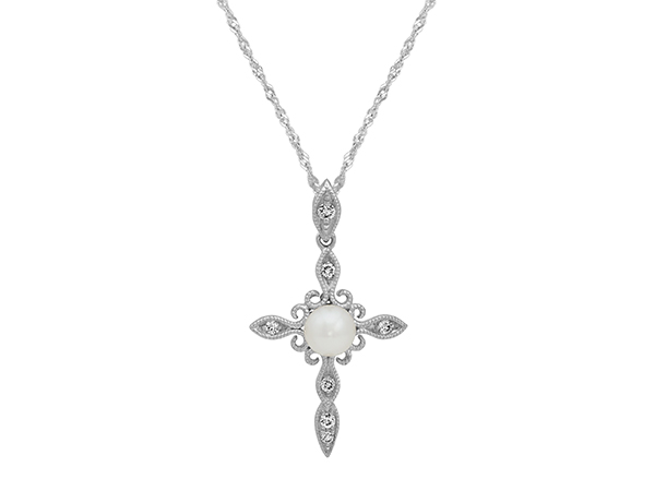 This Pearl and Diamond Vintage Cross Pendant is perfect for those of you looking for a bit of Old World charm. With intricate milgrain detailing, seven round diamonds, and a single 5mm freshwater cultured pearl, this white gold pendant will be your new favorite.