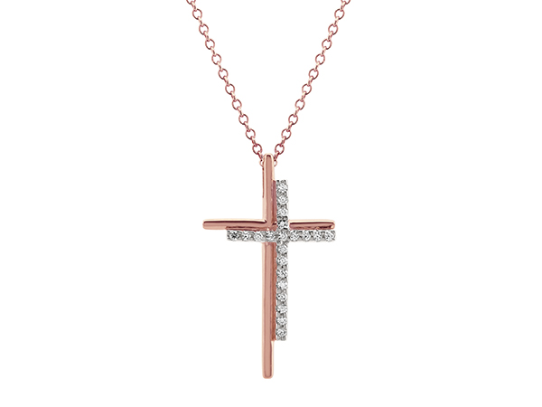 It’s double the fun with this Diamond Double Cross Pendant in 14k Rose Gold! This standout design features two overlapping crosses accented by 21 hand-matched round diamonds hanging from a matching 22-inch adjustable cable chain.