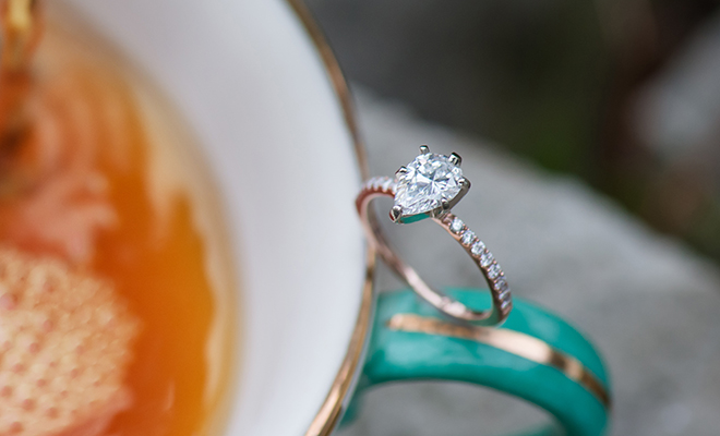 If you’re a classic bride who wants a shimmering center stone without paying the high price of a diamond, a white sapphire is a gorgeous choice for you. This lovely rose gold setting is elegant with the pear-shaped white sapphire center stone.