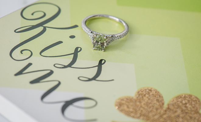 A striking green sapphire center stone gives this classic cathedral-style engagement ring bold color. And the platinum setting detailed with 58 sparkling diamonds gives this ring unmatched shine and sparkle. Your friends will be green with envy!